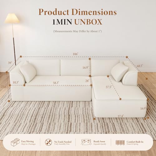 No Assembly Required: Vesgantti cloud sofa arrives tool-free and vacuum-packed for effortless setup. Simply unbox, allow it to expand for up to 72 hours, and it’s ready to enjoy! Our boneless cloud couch can be placed on either side for customizable comfort—start relaxing from the moment you get it. Note: Minor wrinkles are normal after compression, and cushions may take up to three days to fully regain their fluffiness