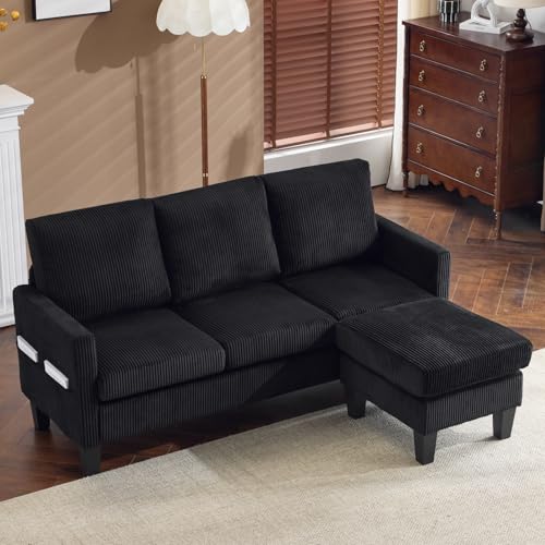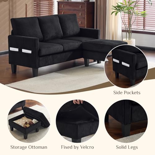 Karl home Small Sectional Couch L Shaped Sofa with Movable Storage Ottoman Corduroy Upholostered Sofa Chaise with Side Pockets for Living Room, Apartment, Studio, Black