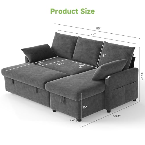 Real Relax 80” Sofa Bed, L Shaped Chenille Sleeper Sofa Couch with Pull Out Bed and Chaise Storage for Living Room, Apartment and Office, Dark Gray