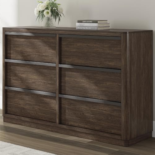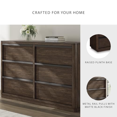 6-DRAWER DRESSER: Casual contemporary styling with a modern vibe. On-trend and elegant, this dresser is inviting with a rich dark brown finish. Full-length metal pulls in a matte black finish add a subtly cool touch to spacious storage drawers