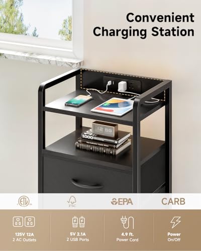 Night Stand Bedside Charger Bedroom – Nightstand with Charging Station & LED Light Strip, Night Stand with Storage Shelf & 2 Fabric Drawers, Morden End Table with U-S-B Ports & AC Outlets