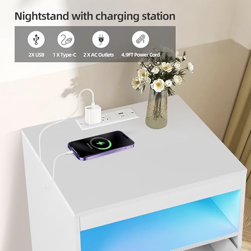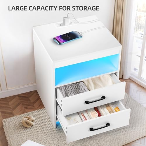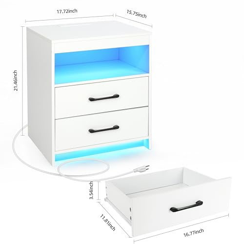 Nightstand with Charging Station and Ambient Light, Equipped with 2 Drawers and an Open Bedside Table, Modern Side Table, White