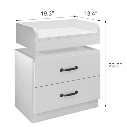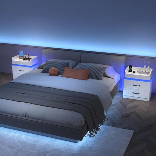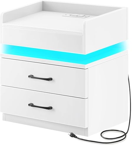 [LED Night Stand with 2 Large Drawers]: LED nightstand size 23.6’’H x 13.4’’D x 19.3’’W. The combination of 2 storage drawers and tabletop storage gives this white nightstand amazing large storage capacity. The practical design of 2 drawers can meet your daily storage needs and keep your room organized. The suspended space in the middle also brings some storage and display functions