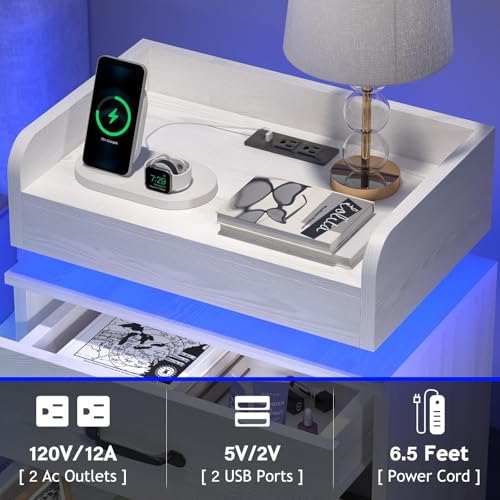[Practical & Humanized Design]:The 3 sides of the nightstand with charging station have streamlined baffles, which enhance the overall aesthetics of the nightstand and increase the safety of the items on the table during use, making it very user-friendly. The bedside table for bedroom is made of high quality MDF, with a solid structure and good stability. The white led nightstand with charging station has a smooth, waterproof surface, easy to clean and can be used for a long time