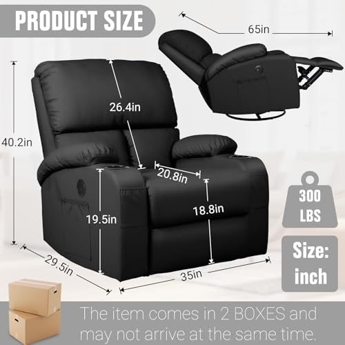 Rocking Recliner Chair, Massage Rocker Recliner Chair with Vibration Massage and Heat, USB and Type-C Ports,360° Swivel Faux Leather Chairs, Living Room, Bedroom, Nursery, RV, Black