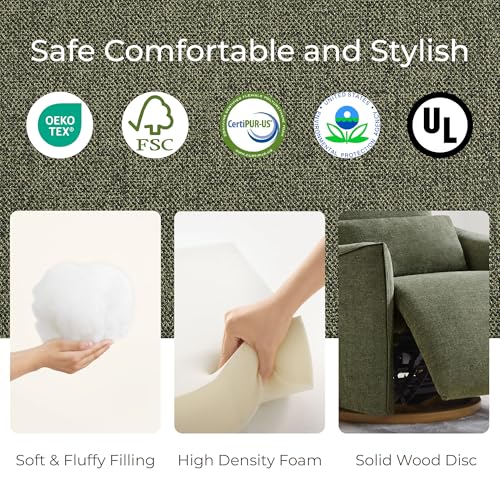 Certified Safety & Sturdy – Your safety and peace of mind are our top priorities. This nursery glider recliner features an EPA-certified wooden frame. Its fabric meets OEKO-TEX standards, and the foam is CertiPUR-US certified, collectively ensuring a safe and healthy environment for you and your baby. The electrical components are TUV, UL, and ROHS certified, providing protection against electric shocks, fires, and other potential hazards. Plus, with a patented Leggett & Platt mechanism that supports up to 350 lbs, it offers lasting durability and stability.