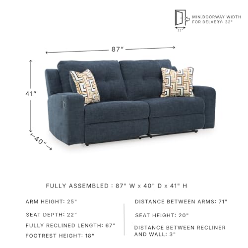 DIMENSIONS: Measures 87″ W x 40″ D x 41″ H. Fully reclined length: 67″. Distance between recliner and wall should be at least 3″. Fits through doorways 32″ or wider
