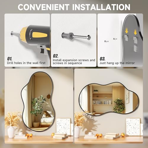 BIDIRECTIONAL SUSPENSION – Our bathroom asymmetrical mirror frame is equipped with 3 hooks, giving it the function of bidirectional suspension. You can easily and stably install the mirror by accurately punching holes in the corresponding positions on the selected wall according to your actual installation space and personal usage habits, without the need for complex installation processes, saving you time and energy.