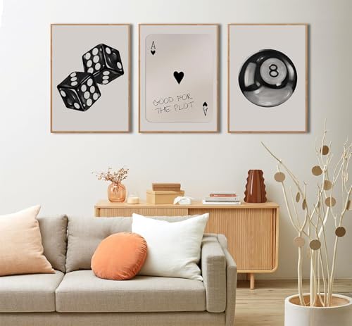 3Pcs Black and White Poker Dice Wall Art Funky Retro Y2K Trendy Preppy Pictures Lucky 8 Ball Poster Canvas Prints Artwork Painting for Game Room Apartment Dorm Aesthetic Decor 12x16in Unframed