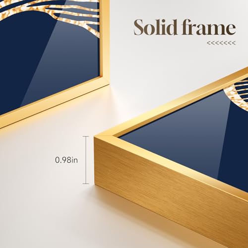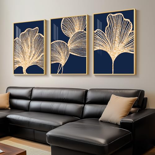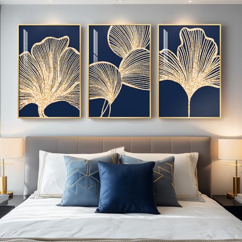 Modern Luxury Wall Art: This set of 3 large 24×36 inch framed modern luxury wall art features navy blue and gold ginkgo leaf designs, perfect for bedroom wall art and stylish home decor