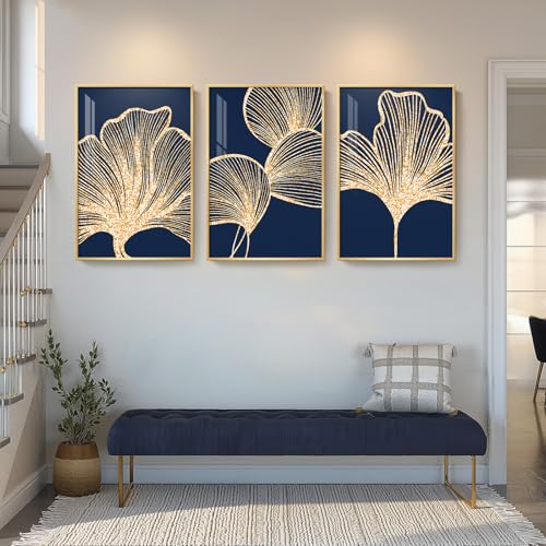 Versatile Wall Decor: Suitable for bedroom, living room, hallway, or office, this luxury ginkgo leaf wall art set blends navy blue and gold tones to complement contemporary, minimalist, or elegant interiors