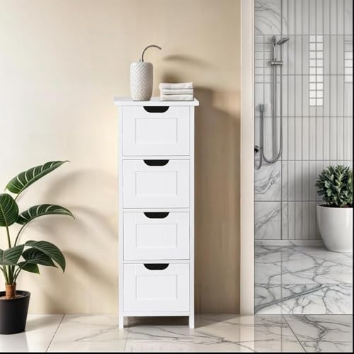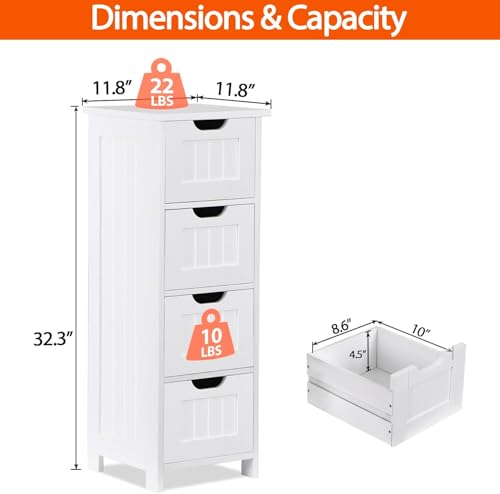 Bathroom Storage Cabinet, Floor Freestanding Wooden Side Organizers w/4 Drawers & Anti-Tip Kit for Bathroom Living Room Hallway Office Study, White