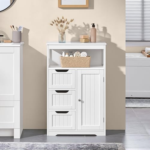 Yaheetech Bathroom Floor Cabinet Wooden Storage Organizer with 1 Door and 3 Drawers, Free-Standing Cupboard for Kitchen/Living Room/Bathroom Use, White