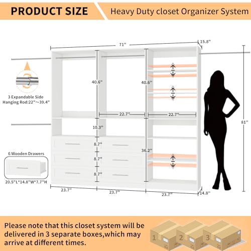 【Customize & Maximize Your Modular Closet System】Three modular closets (23.7″ W × 15.8″ D × 81″ H each) come together to make a fully customizable closet system with 6 drawers(20.5″L x 14.8″W x 7.7″H each), 8 shelves (3 adjustable), and 5 hanging rods (2 inner + 3 extra side rods). The full setup measures 71.1″ W × 15.8″ D × 81″ H and can expand up to 189.3″ W with three extra rods. There’s plenty of room for everyday essentials, shoes, bags, accessories, and seasonal items. Its large, customizable capacity can hold all of your belongings while keeping everything organized and easy to find.