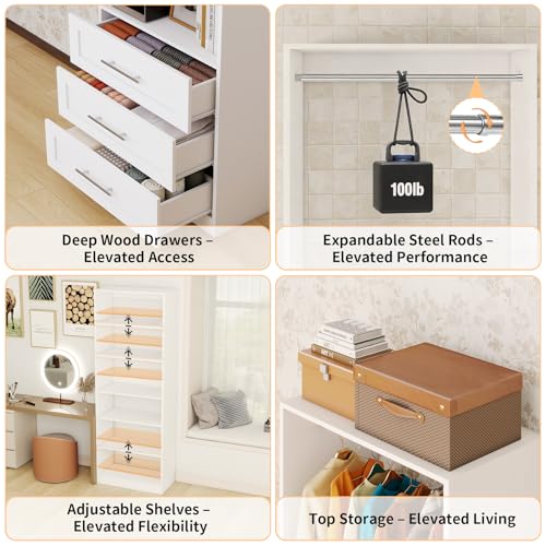 【Heavy-Duty & Reinforced, Engineered for Durability】This closet system supports over 2000 lbs in total, with reinforced panels and heavy-duty rods delivering exceptional strength and stability. The extendable hanging rod is made from 0.6mm stainless steel—three times thicker and stronger than the 0.2mm rods used in most closets—ensuring it stays steady and resists sagging even under heavy loads. Built for long-term reliability, it offers sturdy, dependable performance for years to come.