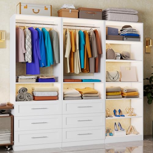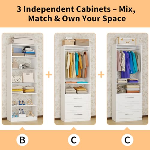Closet System with 3 Sets, Max 189″L Closet Organizer System with 6 Drawers & 8 Shelves, Customizable Modular Closet System with 5 Hanging Rods, Standalone Walk-in Closets, Sturdy Garment Rack, White
