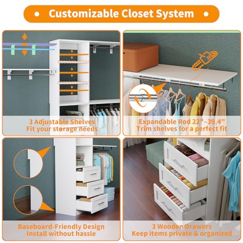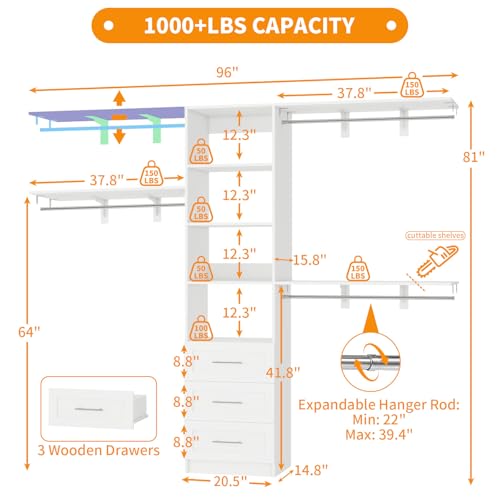 Closet System with Drawers, 5FT-8FT Closet Organizer System 96″ Walk in Wood Closet Storage System with Shelves Hanging Rods Corner Wall Mount, White