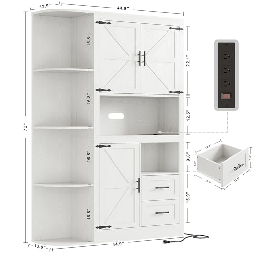 IRONCK 70″ Farmhouse Kitchen Pantry, Storage Cabinet with Power Outlets, 4 Side Shelves, Buffet Sideboard with Microwave Stand, Coffee Bar with 2 Drawers, Cupboard for Dining Room, White