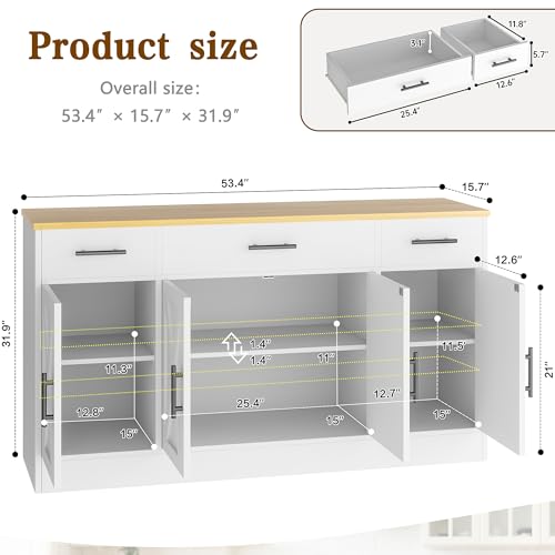 Vongrasig Buffet Cabinet with Drawers, 53” Large Sideboard Buffet Coffee Bar, Modern Farmhouse Kitchen Storage Cabinet with Shelves and Doors, Wood Buffet Table for Kitchen, Dining Room, White