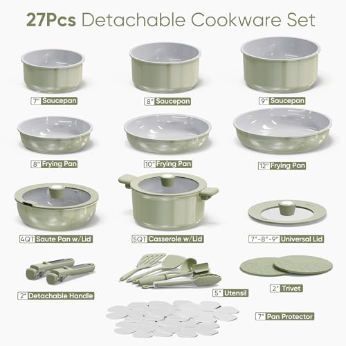 CAROTE 27pcs Ceramic Cookware Set Nonstick, Pots and Pans Set Non Stick, Non Toxic Cookware Detachable Handles, Dishwasher/Oven Safe, RV/Camping Cookware, Pan and Pot with Kitchen Utensils, Green