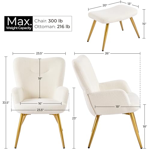 Solidly Constructed: Elevated on four sturdy metal legs, this small accent chair set is crafted from a selected engineered wood frame, boucle fabric upholstery and high-resilience foam, with a weight capacity of 300 lbs for the chair, and 216 lbs for the ottoman