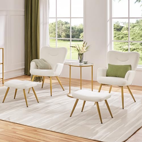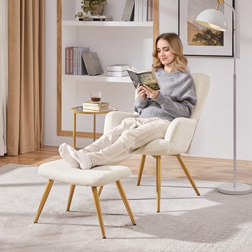 Yaheetech Small Accent Chair with Ottoman Set, Boucle Armchair and Footstool, Lounge Reading Chair with Golden Metal Legs for Living Room/Bedroom/Office, Ivory