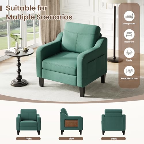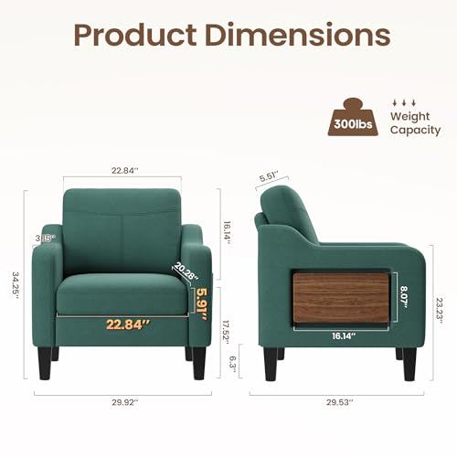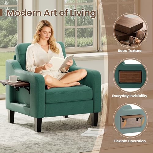 Accent Chair for Living Room Modern Linen Upholstered Armchair Side Wooden Fabric Sofa Chair with Foldable Table 2 Side Pockets Comfy Reading Chair for Bedroom