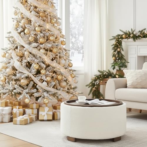 30 Inch Round Storage Ottoman Coffee Table, Modern Boucle Ottoman with Lift-Off Lid and Solid Wood Legs for Living Room, Bedroom, Corners, Apartments (Beige)