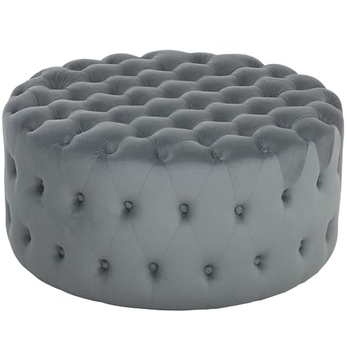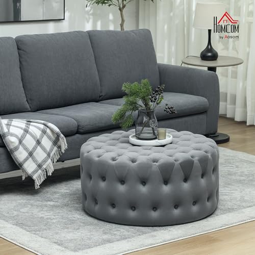 HOMCOM 31.5″ Round Ottoman, Large Velvet-Feel Upholstered Foot Stool with Button Tufted Design and Padded Seat for Living Room, Entryway, Dark Gray