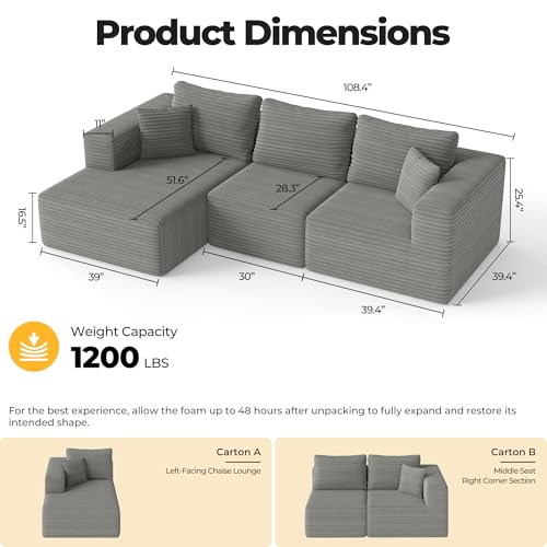 𝐔𝐥𝐭𝐢𝐦𝐚𝐭𝐞 𝐂𝐨𝐦𝐟𝐨𝐫𝐭 𝐂𝐡𝐚𝐢𝐬𝐞 𝐃𝐞𝐬𝐢𝐠𝐧: Sink into unparalleled comfort with our spacious boneless couch, featuring a generous 29.3″ seat depth. The chaise lounge, crafted with high-resilience foam, provides exceptional support and durability, ensuring a lavish seating experience that invites relaxation, reminiscent of a cloud couch sectional.
