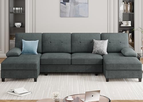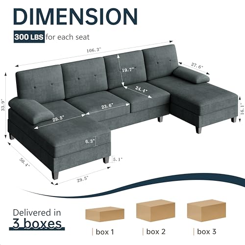 [HIGH QUALITY] Wood frame and breathable fabric surface, this couch is definitely sturdy for long-time use. 300lbs for each seat. Overall dimension of this couch: 106.3″ x 50.4″ x 33.9″. Seat height: 16.1″. With 2 wide chaise lounges, the sectional couches for living room can seat up to 4 people together