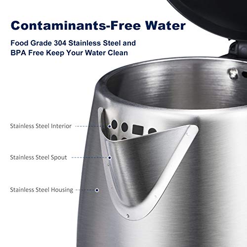 ♨BPA-Free & Food Graded Materials for Health: This electric kettle is made of 304 stainless steel. And all the surface water touches of the water boiler is made of food-graded material, BPA-Free and non-toxic. Our tea kettle is absolutely safe and healthy for boiling water, tea, and coffee.