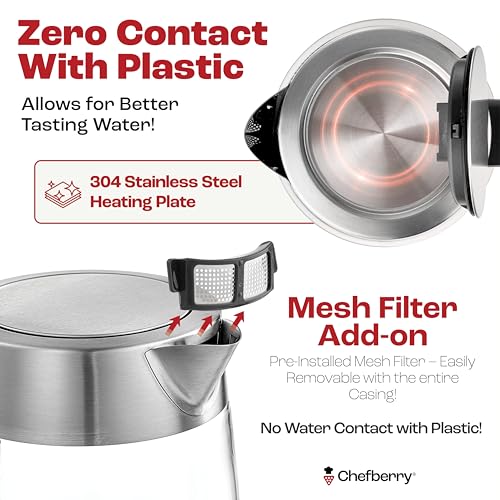 No Plastic – 100% stainless steel water-contact paths: no plastic in the spout or filter, ensuring pure taste and safe heating, Includes a removable plastic mesh FIlter