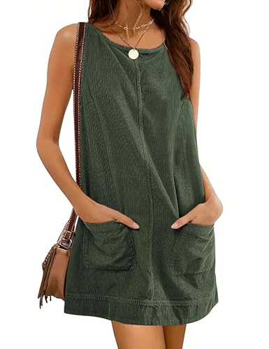 Hooever Women’s Corduroy Overall Dress Round Neck A Line Skirtall Jumper Mini Dress Pinafore with Pockets