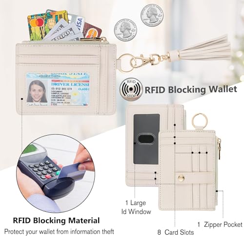 NEW UPGRADE DESIGN:8 x card slots / 1 x large id window / 1 x main compartment with zipper / 1 x detachable wristlet with keyring/ 1 x fashion leather tassel,widened card slots and clear ID window with thumb hole make it easier for you to access the cards.your credit cards,cash,coins,keys and identification card or driver licence,can be well organized inside.